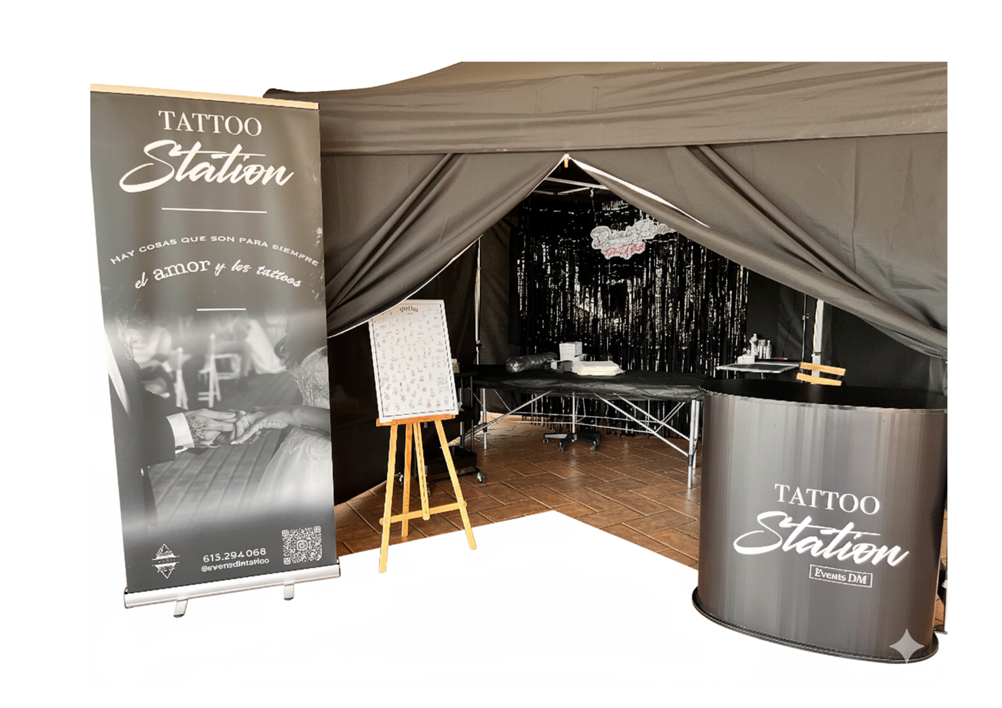 Imagina un rincón único en tu boda: un mini estudio de tatuajes donde tus amigos y familiares puedan llevarse un recuerdo imborrable de ese gran día. Este servicio consiste en montar una carpa cerrada de 3×3 metros en color negro, creando un espacio exclusivo y seguro donde la magia de la tinta cobra vida.